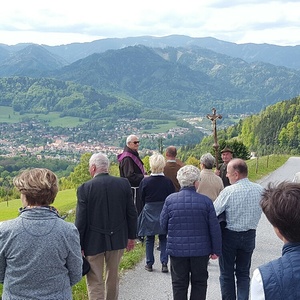 Bei schönem Wetter und toller Aussicht auf Frohnleiten wanderten zahlreiche Personen mit. Pater Simon gestaltete diese Feldersegnung mit Unterstützung der Dirnbergbauern.